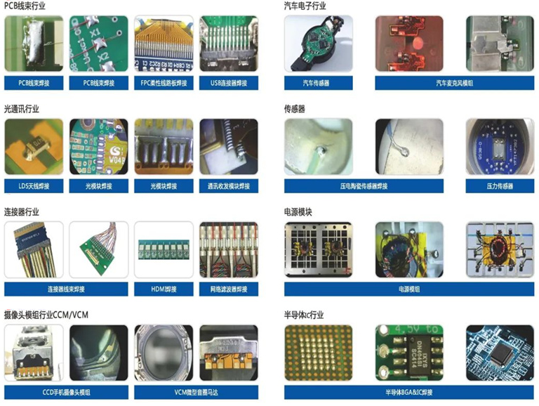 适合激光焊接的材料有SMT后置插件、热敏元件的焊接、难焊元件、微型扬声器/电机、PCB修复焊接、手机的各种元器件等。