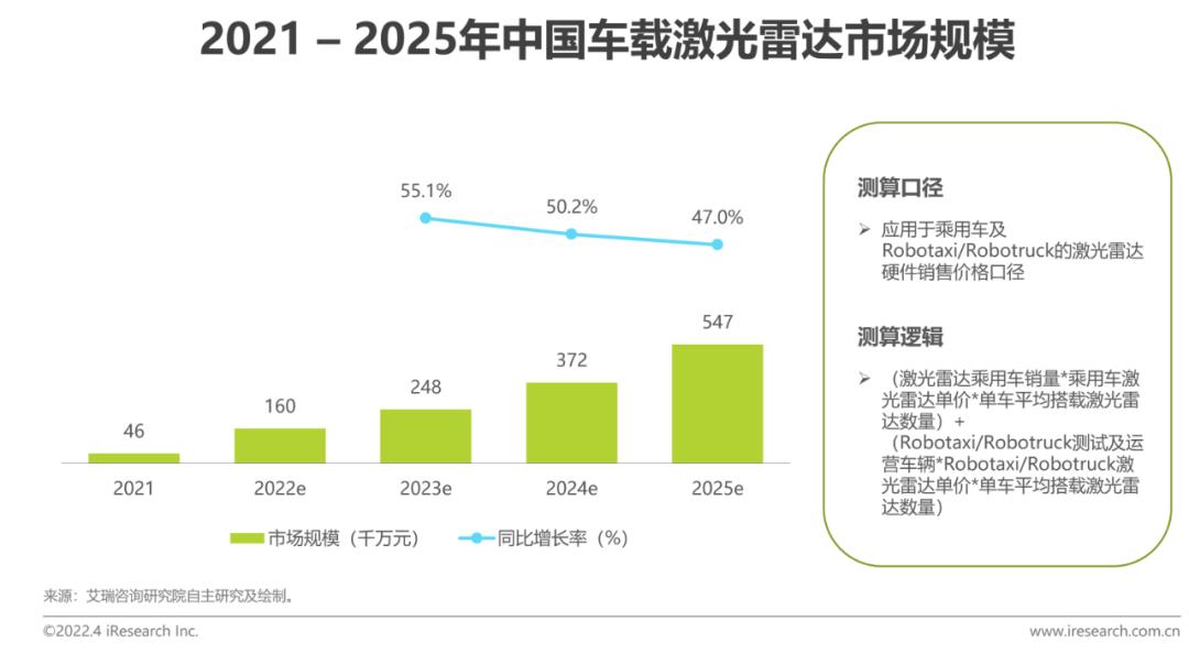 随着辅助驾驶功能的逐渐量产,乘用车辅助驾驶系统已经成为行业标准,其单一功能逐渐向低端车型下沉。与此同时,新功能也在高端机型上不断推出。激光雷达作为辅助驾驶的首选传感器,过去一直受限于成本和体积,难以大规模落地。随着技术和生产效率的进步,近年来激光雷达的成本开始快速下降,各OEM厂商也逐渐将其纳入ADAS传感器方案。2022年,半固态激光雷达的成熟将使其在乘用车市场逐渐爆发。随着主机厂对激光雷达功能开发的深入和激光雷达成本的降低,激光雷达搭载的机型数量将在短时间内保持高速增长。Robotaxi也在政府和下游企业的共同推动下持续开市,测试运营车队数量将保持稳定增长。车载激光雷达市场预计将从2021年的4.6亿元增长到2025年的54.7亿元,实现85.8%的年复合增长率。