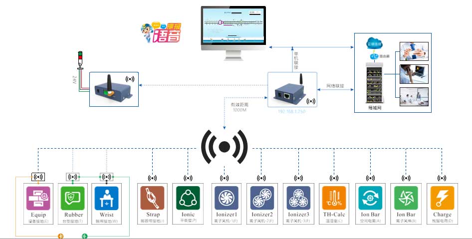 (4)具有手腕带插标带报警及三色指示状态的产品(市场独家仅有),,方便员工自己发现自己的异常并马上调整,再配合系统的智能语音播放,真正做到静电防控有保障。