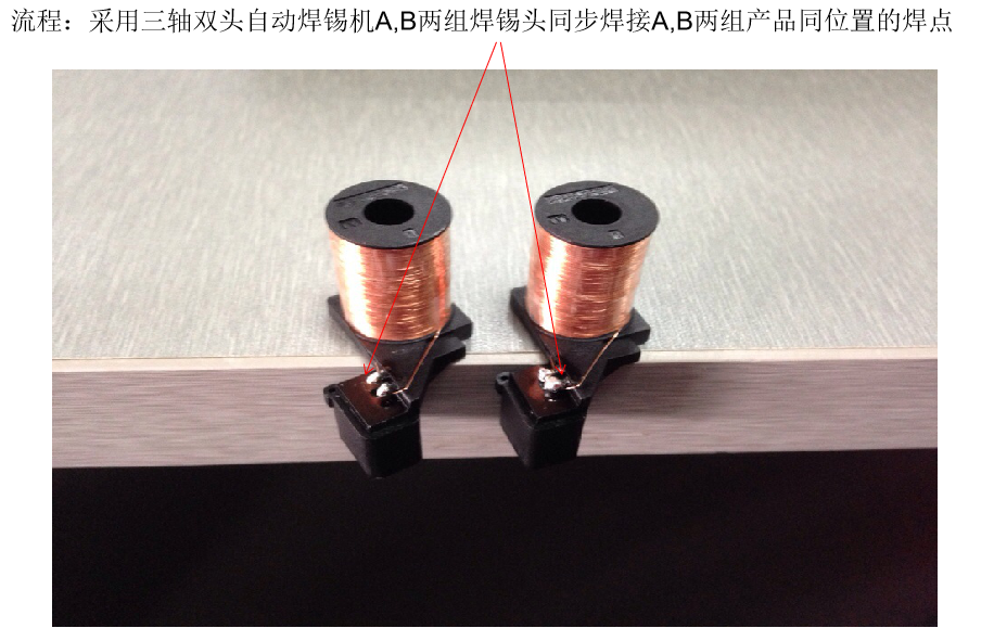 一个产品共计2个焊点,分为A&B两组产品。由同一设备的A&B两组焊锡头对应A,B两组产品同位置的焊点配合同时工作;
